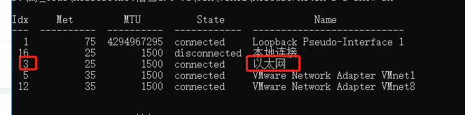 netsh i i show in ,显示具体的Idx: ( 虚IP的网卡实际是哪张网卡,就填对应的Idx)